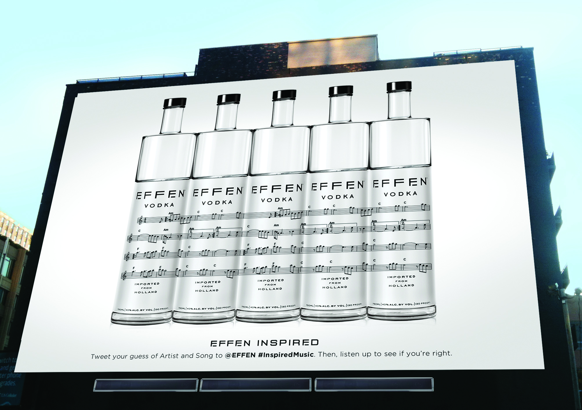 Large billboard with music notes written across the sleeves and a large sound bar below. The notes will be of an up-and-coming band/artist and their top song. Passers will try to guess the artist and song. They will tweet their guesses to @EFFEN #InspiredMusic. If they guess correctly, the song will begin to play through the speakers.