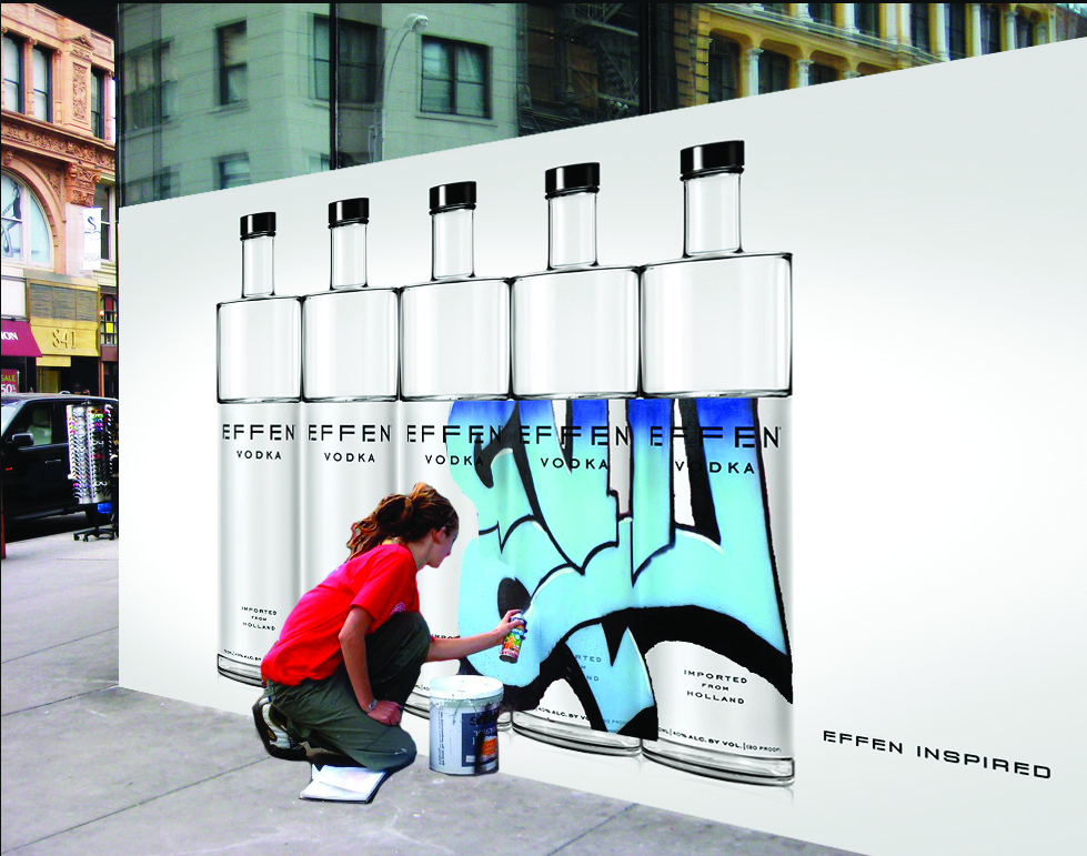Street-level installation ‘billboards’ of EFFEN bottles that serve as guerilla canvases for local artists.